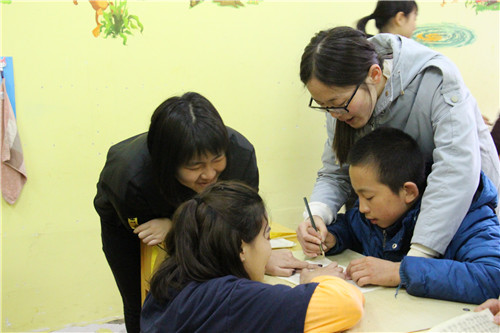 认识每一位孩子后,志愿者为孩子们带来了书写课。起初,孩子们写字比较吃力,有的孩子甚至不知如何握笔。志愿者们握着孩子们的手,从握笔姿势开始教学,带着孩子们写下一笔一划,孩子们也十分配合教学,专注地写下每一个字。书写课后,志愿者们带领孩子们玩开火车与抢凳子等游戏,在欢乐的氛围下,孩子们逐渐放开自我,整个教室中充斥着孩子们的笑声。游戏后,进入“惩罚”环节,游戏失败的孩子需表演唱歌,而孩子们比较害羞,不愿意在大家面前表演。志愿者们耐心鼓励每一位孩子,帮助他们突破自我,唱出歌声。