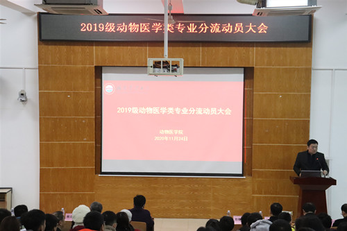 11月24日上午,yl6809永利2019级本科生专业分流动员大会于动医楼T型教室举行。我校教务处处长孙志良,yl6809永利党委书记伍小松,院长郑晓峰,正处级组织委员姚文昌,党委副书记首道,副院长苏建明、刘国华,农业部兽药改革委员曾建国,动物药学系教授,2019级本科生辅导员赵建松,加农正和生物技术有限公司总经理柳高峰出席会议,2019级全体本科生参加会议。会议由郑晓峰院长主持。