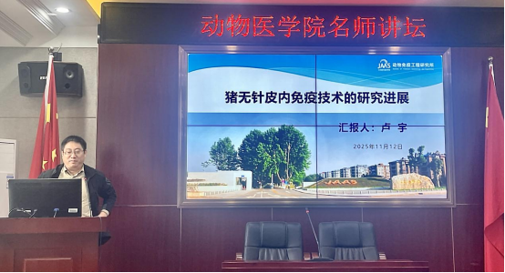 2025年11月12日上午,江苏省农业科学院动物免疫工程研究所副所长、研究员卢宇应yl6809永利邀请,于第三教学楼303会议室作了一场题为“猪无针皮内免疫技术的研究进展”的学术报告。本次会议由yl6809永利副院长湛洋主持,学院部分老师及研究生参加了此次讲座。