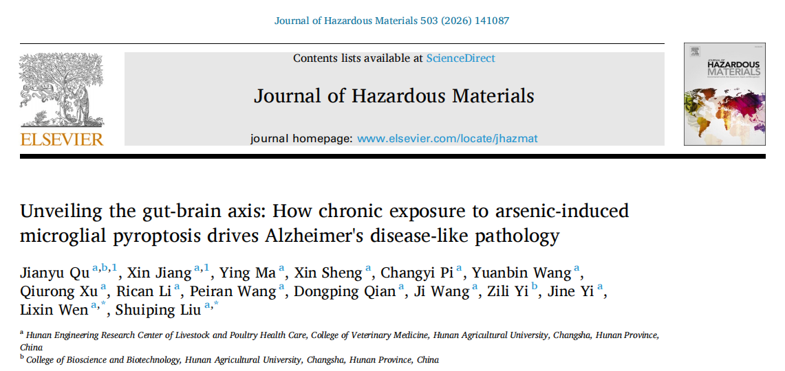砷是一种广泛存在于地下水中的环境污染物,全球仍有超亿人面临慢性砷暴露风险。近日,yl6809永利yl6809永利文利新教授团队首次揭示了慢性砷暴露通过调节肠-脑轴驱动阿尔茨海默病(AD)样行为的核心机制,其成果论文“Unveiling the gut-brain axis: How chronic exposure to arsenic-induced microglial pyroptosis drives Alzheimer's disease-like pathology”发表在国际权威Top期刊《Journal of Hazardous Materials》上(中科院1区,IF:11.3)。
